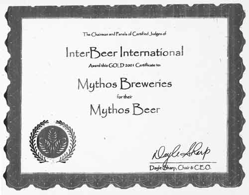 Mythos Beer, the award winning beer at the “2001 Interbeer International Beer & Whiskey Competition” was launched in May of 1997. Produced from select varieties of barley and hops, it is a Lager with a rich head, bright blonde colour and a pleasant, refreshing taste - a guarantee of enjoyment for those who choose to drink it.